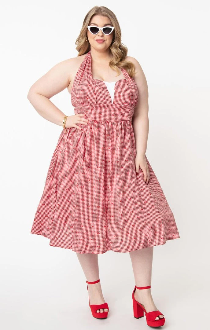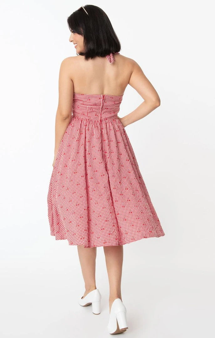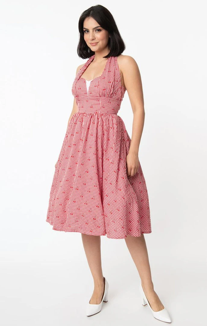 A retro legend, dames! Presenting a stunning mid-century inspired silhouette from Unique Vintage, the Shelia Dress is crafted in a lightweight woven fabric that dances with red cherries printed throughout the red and white gingham pattern. The self tie halter secures the sweetheart bodice while the banded waist is cinched with a back zipper. The gathered swing skirt drops to your knees, outfitted with side pockets for modern fun!