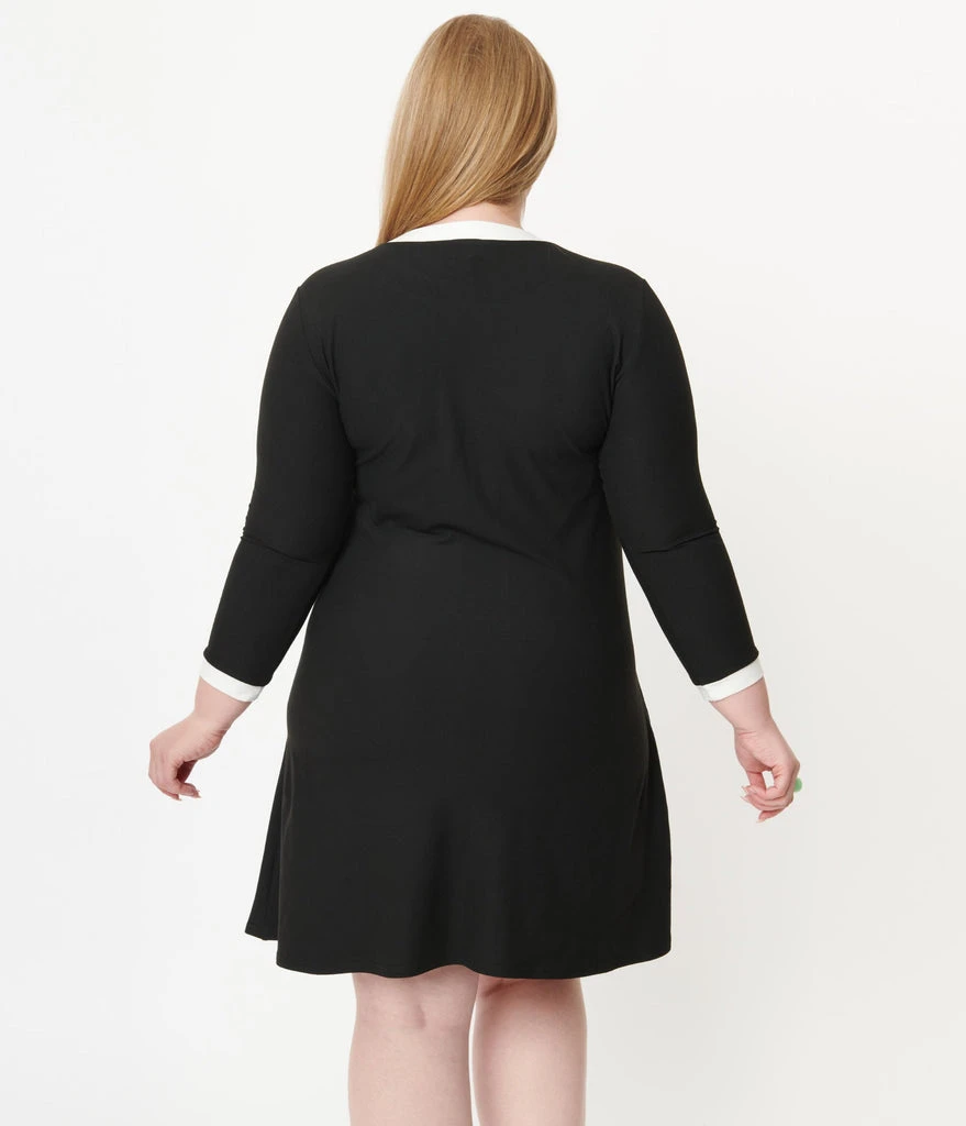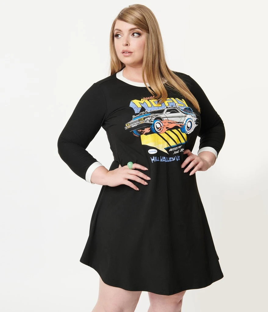 Well looky what we have here! A playful piece from Unique Vintage in collaboration with the iconic Universal film, Back To The Future, this casual flare is crafted in a silky black jersey stretch and boasts a stunning graphic print of the DeLorean Time Machine on the front. The modest crew neckline is set in solid white while the three-quarter length sleeves drop into a matching cuff. The tapered silhouette is complete with a flirtatious flare skirt that dances high above the knees!